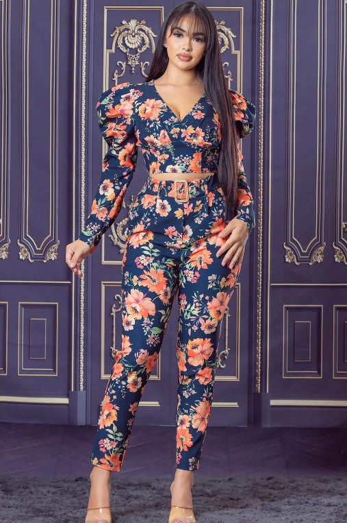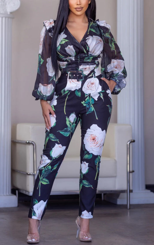 Floral High Waisted Pant Set in Black Floral